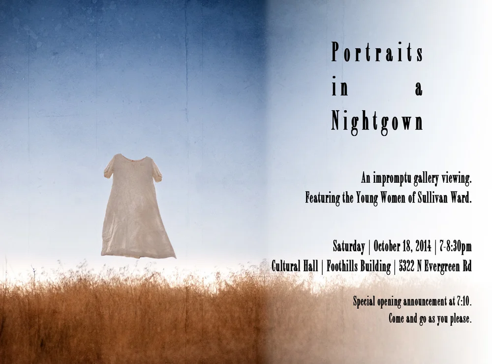 The project is a series focusing on the premise that while we are all different and tell different stories at our very core we are all the same in that we all are divine, being spirit children from our Heavenly Father. Photographs will feature young women from my community, each wearing the same vintage nightgown and being placed in natural surroundings.